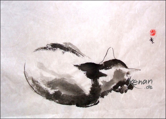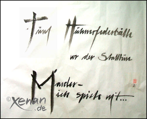 | Diesmal ein Haiku von mir. Nachdem der Marder uns heimgesucht hatte waren unsere Junghühner alle dahin. Aber einen zweiten Besucht im Hühnerstall überlebte er nicht... Und so habe ich dieses Erlebnis zusammen mit meinen ersten Kalligraphie- Stunden umgesetzt. | ||