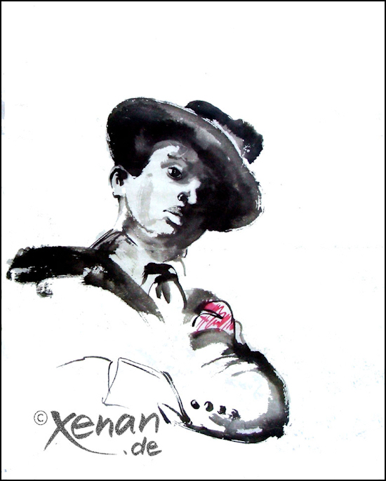Die Sapeur sind farbenfrohen Paradiesvögel, die sich in teurer Kleidung durch die Slums der afrikanischen Republik Kongo bewegen. Dieser Ausdruck von Würde und Stolz hat mich sofort begeistert, als ich die ersten Fotos von ihnen sah. Und dann entstand dieses schöne Tuschebild eines stolzen Sapeur.