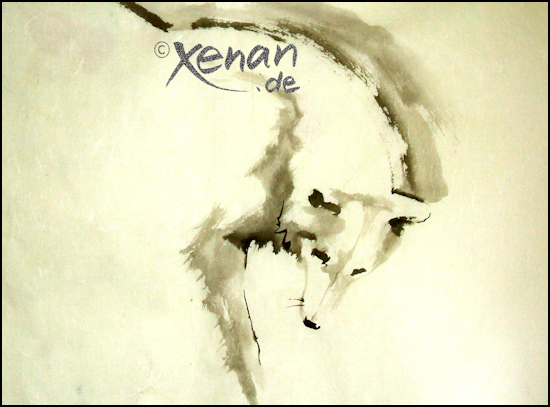So, im März und April habe ich wenig gemalt und mehr die Ausstellungen in Schloss Mitsuko vorbereitet. Nachdem die Kamelien-Ausstellung fertig ist, hängt nun die Ausstellung „Wege der Schlichtheit V“. Auch mit vier Bildern von mir, davon eines ein sehr lebendiges Familien-Storchenbild. Der Besuch ist sehr empfehlenswert, denn es gibt vieles zu entdecken, anzufassen und den wunderschönen Hain zu bewundern. Dass der erste Wolf bereits verkauft ist, wurde sehr bedauert und nun arbeite ich am nächsten Räuber. |